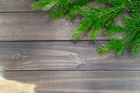 Wooden background with branches of a Christmas tree. Concept for Christmas and New Year. Banner. Flat lay, top view.