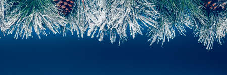 Christmas Tree Branches as a Frame on dark blue background, copy space for text