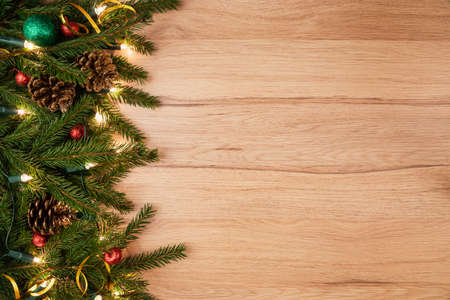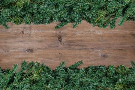Top view of Christmas background made of fir tree branches. New year concept with copy space on wooden background.