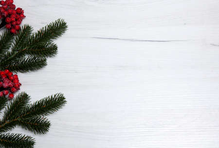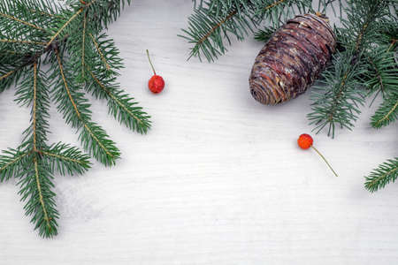 Christmas and New Year's composition. Top view of spruce branches and red berries on white background. Christmas frame made of dark fir branches, cones, red berries and decorations.