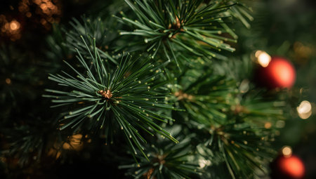 A close-up of a pine branch with a pinecone and red Christmas ornaments, surrounded by glowing bokeh lights, capturing the festive holiday spirit.