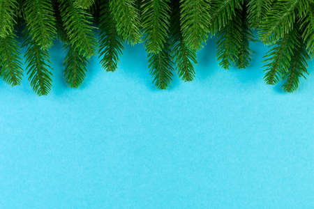 Top view of colorful background made of green fir tree branches. New year holiday concept with copy space.
