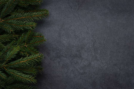 Christmas decoration concept - spruce branches on a black vintage stone background with copy space.