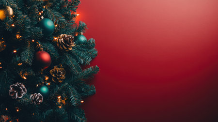Christmas decoration with green pine branches and colorful baubles on a red background, a flat lay banner for holiday celebration greeting card design template, with copy space. --chaos 30 --ar 16:9 --v 6.1 Job ID: e9fd08e0-eb69-4ab1-8552-79d48bcd67ba