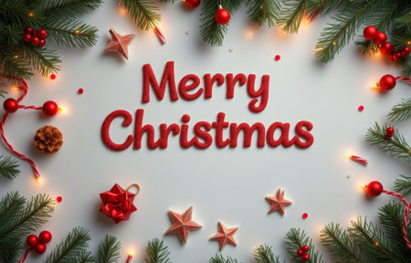 Festive Christmas scene with fir branches, ornaments, and lights.