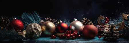 Christmas decorations with red baubles and berries on lush green pine branches. The dark green glittery background adds elegance to the festive composition.