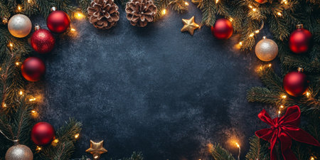 A flat lay of Christmas ornaments, including red and gold baubles, pinecones, and berries, arranged on a dark textured background. Warm festive lights enhance the holiday charm.