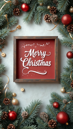 A beautifully framed Merry Christmas sign is nestled among lush evergreen branches, pine cones, and vibrant ornaments, creating a warm holiday atmosphere. The rich red background of the sign contrasts beautifully with the greenery, while the shiny baubles and delicate ribbons add a touch of festive elegance.