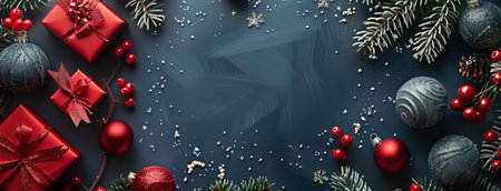 Christmas banner with gift boxes, fir branches and red balls on dark blue background.