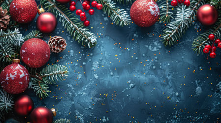 Festive red baubles, gold stars, and green pine branches arranged on a blue background, creating a holiday atmosphere.