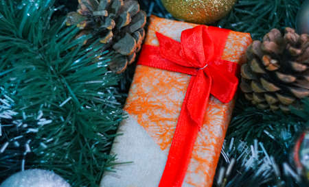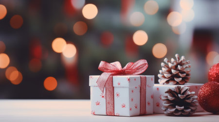 Christmas gifts and pine cones with bokeh light background.