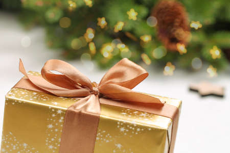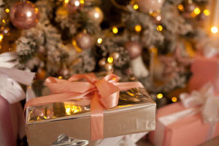 beautiful festive surprise gift box with a gold bow on a bokeh background and near the Christmas tree for new year and valentine's day