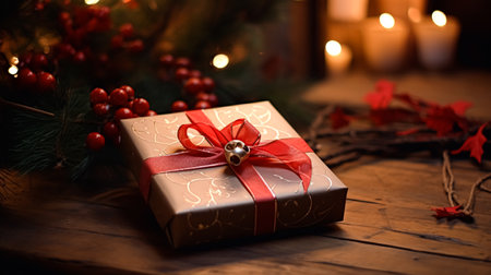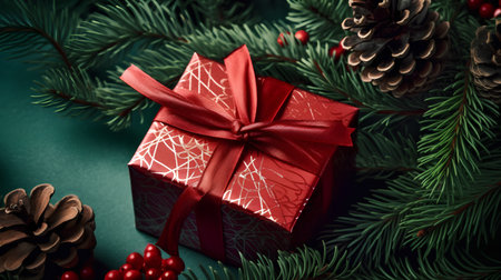 Christmas gift wrapped in simple red ribbon, surrounded by fresh pine branches and natural pine cones