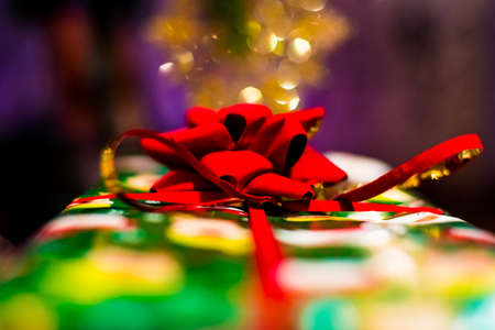 Christmas gift is wrapped under the Christmas tree with lights glowing in the background
