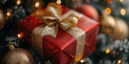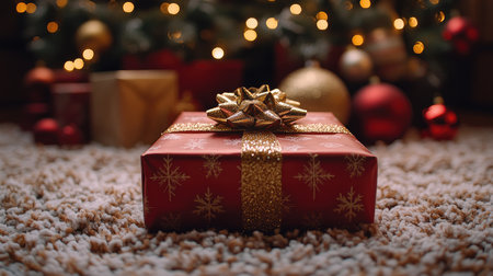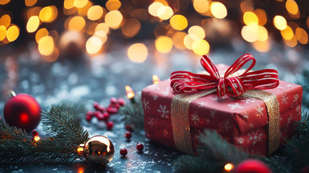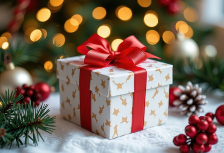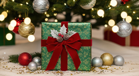 A beautifully wrapped Christmas gift box adorned with a festive tree design and red ribbon, surrounded by ornaments and pine branches, with a bokeh background of warm lights.