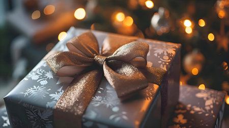 Luxurious Christmas Present. Close-up of a Beautifully Wrapped Gift Box Adorned with Gold Ribbon and Snowflake Pattern Against a Warm Bokeh Background.