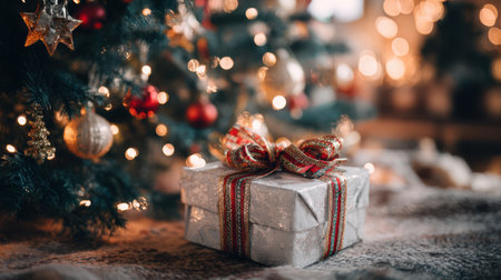 Christmas themed gift box under a decorated tree with ornaments and twinkling lights, cozy holiday mood