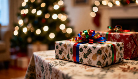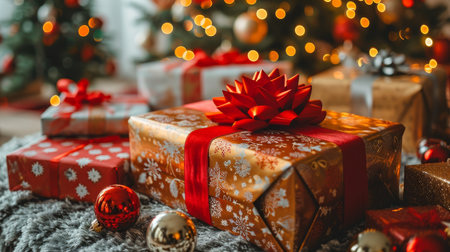 Close-up of beautifully wrapped Christmas presents tied with a vibrant red ribbon, nestled beneath a festive fir tree adorned with twinkling lights.