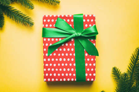 Christmas gift box with red ribbon and fir branches on green background.