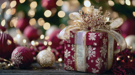 A festive Christmas gift wrapped in red with snowflake patterns and a sparkling red bow, surrounded by ornaments and glowing holiday lights in a winter setting.