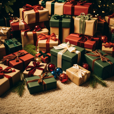 Beautifully wrapped holiday gifts with shiny paper and bows, placed under the Christmas tree