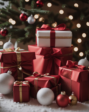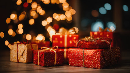 Beautifully wrapped Christmas gifts in vibrant red and gold, set against a softly illuminated background of festive bokeh lights, perfect for inspiring holiday cheer.