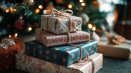 Stack of colorful patterned Christmas gifts with rustic jute bows in warm festive room with tree and ornaments.