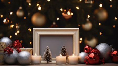 A festive Christmas scene with a blank photo frame in the foreground