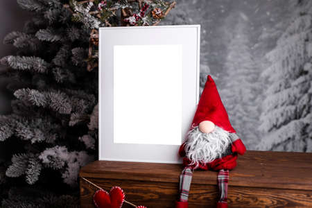Christmas poster frame mock up. Hand made doll green fir branches red paper gift boxes lights garland lamp. Wooden empty frame white background. Home new year decor concept copy space mock up banner