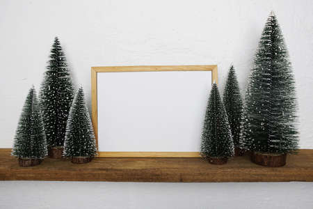 Christmas decoration with blank photo frame and Christmas tree on wooden table.