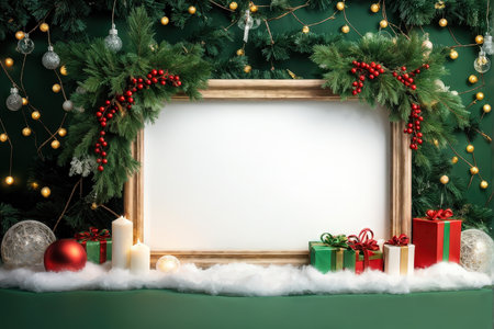 This image features a blank frame surrounded by Christmas decorations, red baubles, candy canes, gifts, and pine branches, offering a festive and joyful holiday theme perfect for seasonal greetings. AI generated image