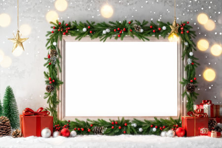 Mock up blank frame with christmas tree and decorations.