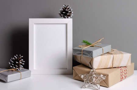 Photo frame mockup with pile of decorated christmas gift boxes over grey wall