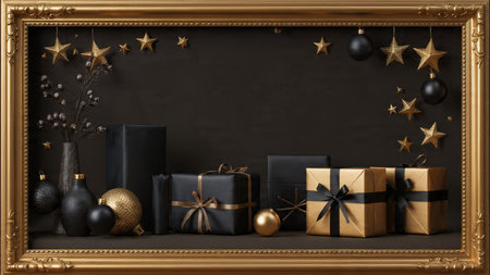 Christmas and New Year greeting card. Gold frame with christmas decorations and gift box on black background.