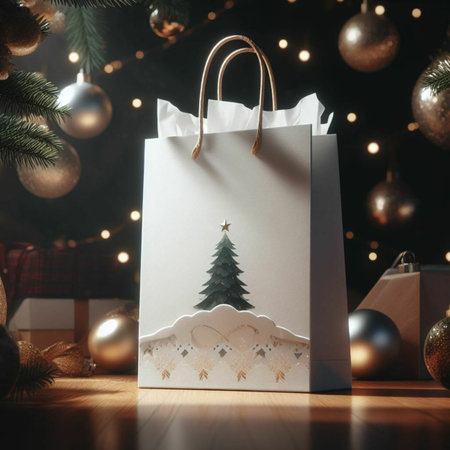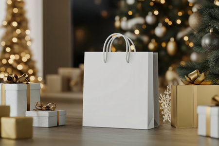 White shopping bag mockup surrounded by Christmas presents and trees, perfect for showcasing your holiday designs