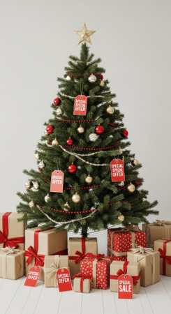Christmas sale presents background with festive decorations, snowflakes, AI generated