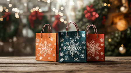 Three gift bags with snowflake designs sit on a wooden table in front of a Christmas tree