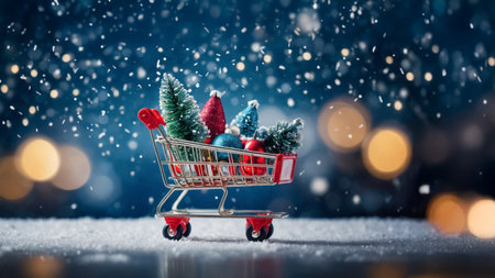 This image features a shopping cart filled with colorful Christmas ornaments, set against a warm bokeh background of fairy lights, ideal for holiday advertising or editorials.