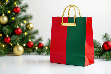 Capture the essence of the holiday spirit with this enchanting image of a cozy gift bag surrounded by colorful ornaments and lush evergreens.