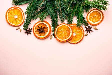 Christmas pink pastel background of Dry Oranges Slices and fir branches.