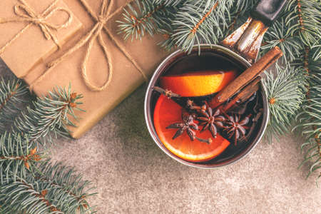 Hot mulled wine in a small vintage pan with christmas tree on the gray slate background. Christmas or winter warming drink. Top view. Copy space