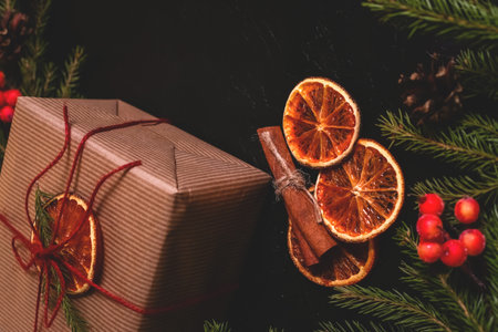 Christmas composition with handmade kraft paper gift box, dried citrus slices, cinnamon, anise, pine cones and fir tree branches, top view copy space