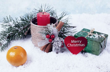 The board with apples, orange and lemon, a twig of firtree with balls, a small gift box and a burning candle. Top view.