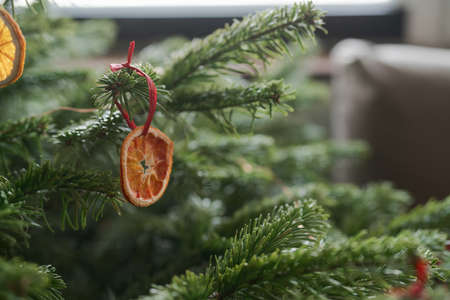 Closeup small christmas tree with dried oranges as decorations for holidays
