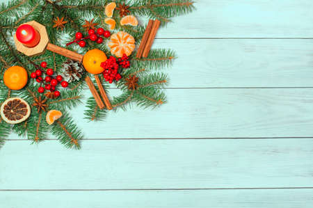 New Year's composition of tangerines and Christmas tree branches on a wooden background. christmas background