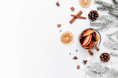 Christmas banner flat lay with glass cup of Mulled Wine, gift box, decorations