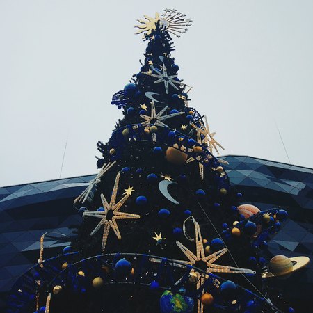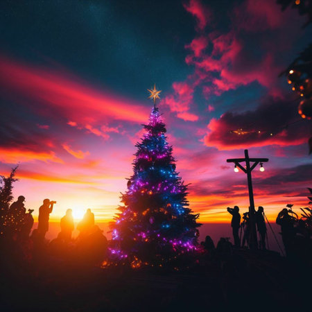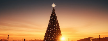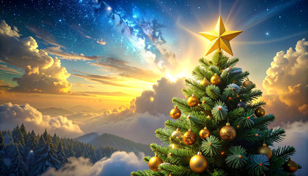 A decorated Christmas tree with a golden star stands against a dramatic sky filled with stars, clouds, and a vibrant sunset.