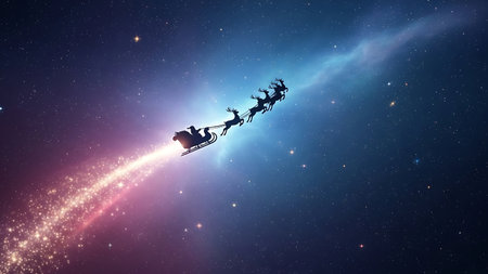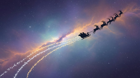 Experience the enchanting journey of Santa's sleigh through a starry night sky, accompanied by reindeer amidst a magical and cosmic backdrop filled with wonders.