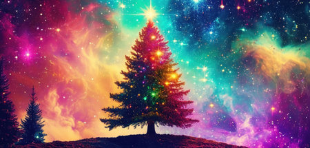 Christmas tree in the starry sky. 3D illustration. Elements of this image furnished by NASA