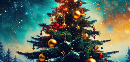 Christmas tree decorated with red and gold balls and garlands on blue background